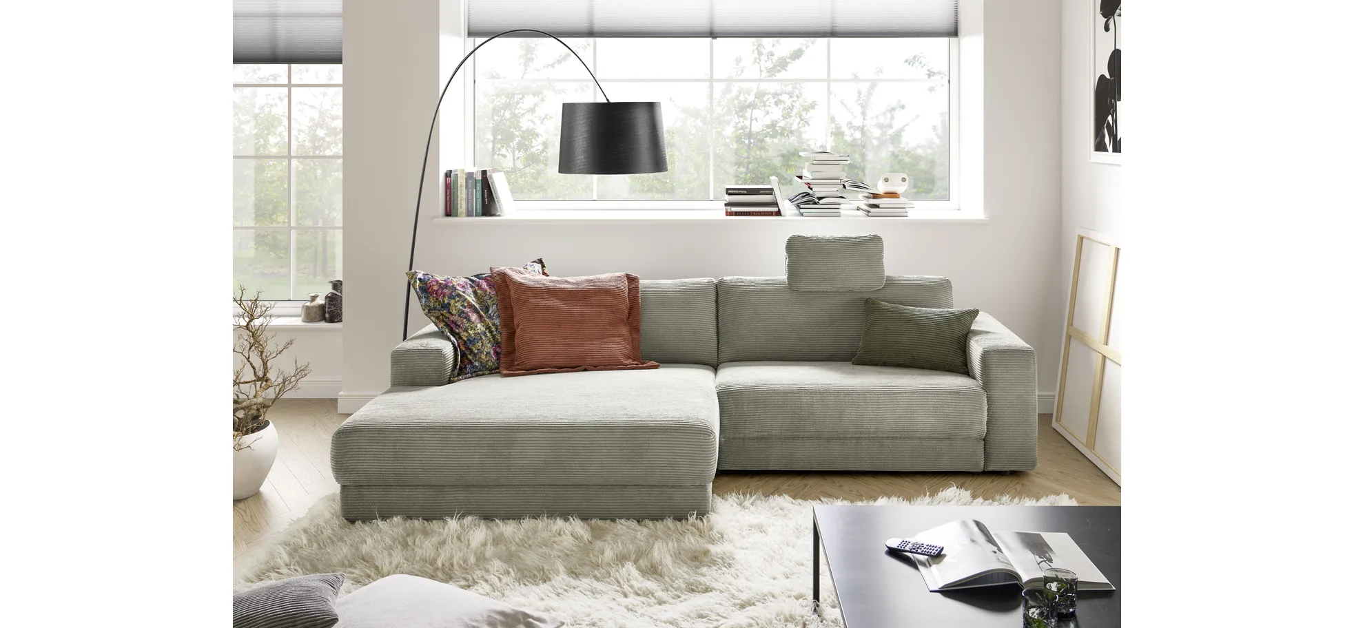 Modern, groß und viel Platz bietet das attraktive Polsterprogramm mit Lounge-Charakter. Breiter Typenplan und umfangreiche Stoffauswahl bis hin zu attraktiven Cord-Varianten erlauben vielfältigste Möglichkeiten für unterschiedlichste Platzverhältnisse. Eine hochwertige PUR Schaumpolsterung aus verschiedenen Stärken garantiert wunderbar angenehmen und weichen Sitzgenuss. Elemente mit teilmotorischer Relaxfunktion sorgen für Funktionalität und Komfort und schaffen entspannte Sitz- und Liegepositionen. Sie verlängern das Fußteil und verändern den Neigungswinkel der Rückenlehne. Kopfstützen variabel einsteckbar oder Multifunktionskopfstützen geben zusätzlich Halt und ergänzen das Programm.