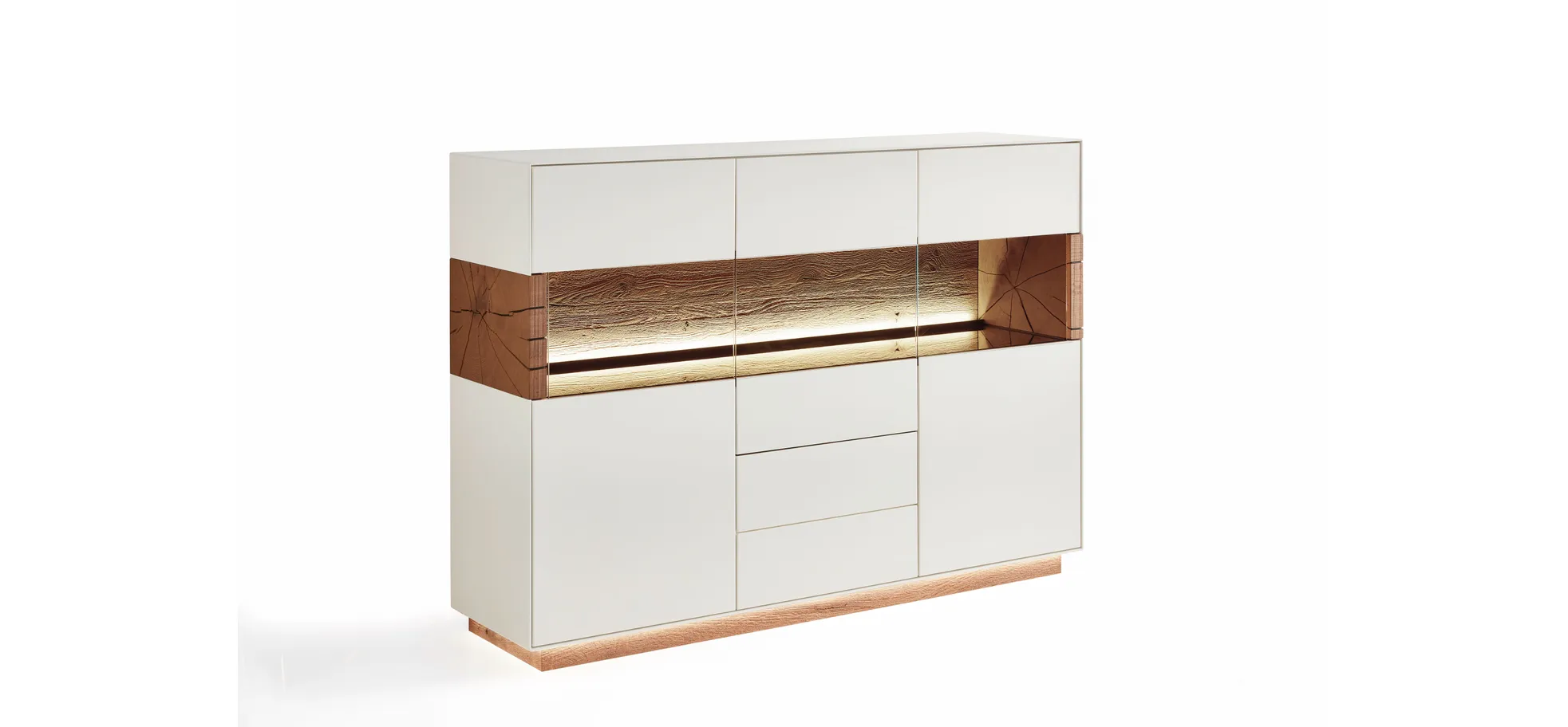 Highboard – mit Beleuchtung, Kerneiche Umato massiv, Birke Weiß lackiert